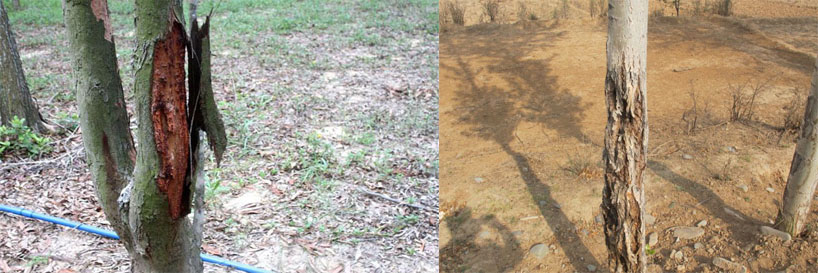 于各種針、闊葉林,多由真菌引起。被害枝、干的樹皮局部變褐、發(fā)軟,最后壞死、干裂或下陷,枝干被病斑環(huán)繞一周后枯死。如林木抗病力增強(qiáng),病斑外圍可形成愈傷組織,限制病菌擴(kuò)展。板栗疫病是最嚴(yán)重的森林病害之一。病菌主要通過細(xì)小傷口侵入,在枝干上引起典型的爛皮病斑,剝開病皮可見扇形菌絲片。