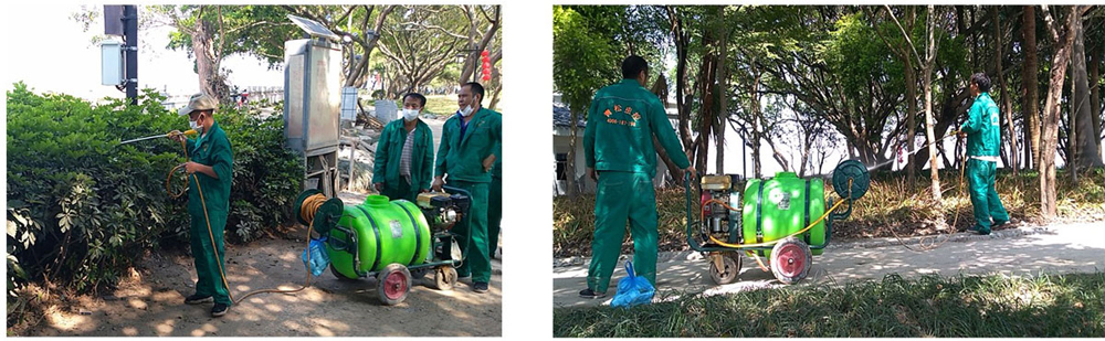 對(duì)大型噴霧車不方便進(jìn)入的蚊子聚集的密集區(qū)域采用手推式動(dòng)力噴霧機(jī),機(jī)動(dòng)能力強(qiáng),載藥量大,噴射強(qiáng)度大,持續(xù)有效的消滅這些區(qū)域的蚊蟲。