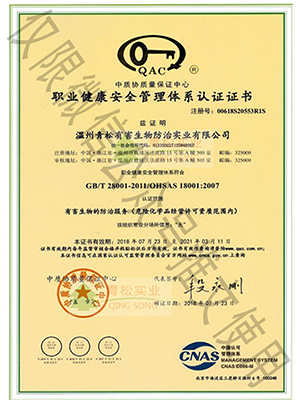 國家級有害生物防制認(rèn)證機(jī)構(gòu)A級證書/浙江省病媒生物防制服務(wù)機(jī)構(gòu)能力等級一級資質(zhì)