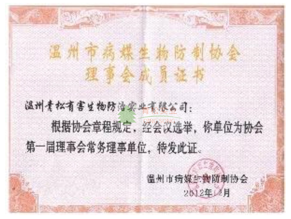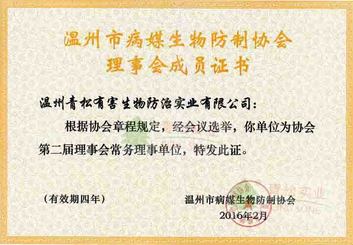溫州市病媒生物防治協(xié)會理事會成員證書